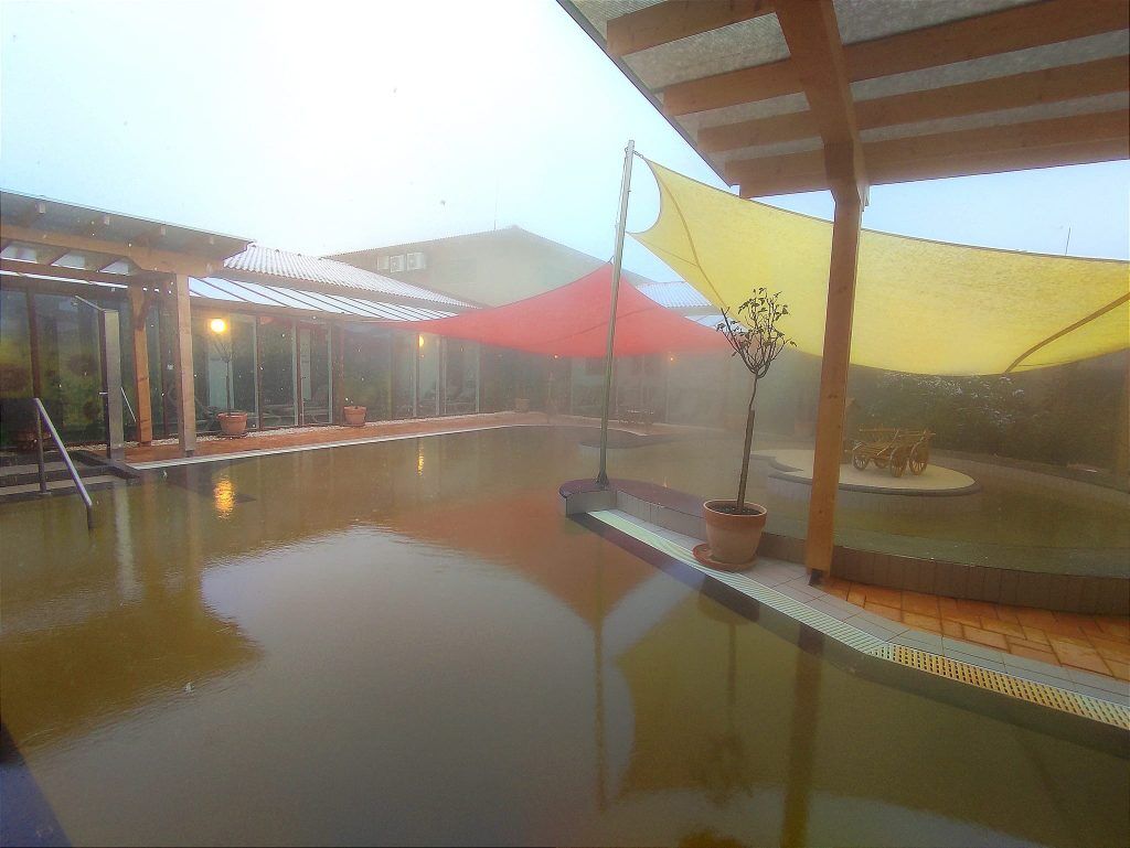 The bath boasts a thermal experience pool, two medicinal sitting pools, a Spray Park for children, sauna and steam cabin facilities, and a restaurant and café. The thermal water temperatures range from 38 to 51 degrees Celsius.